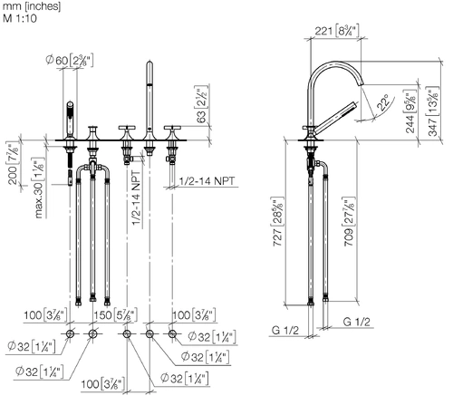 Dornbracht VAIA Wannen-Fünflochbatterie, Wannenrandmontage, automatische Umstellung, Kreuzgriff, Ausladung 220mm