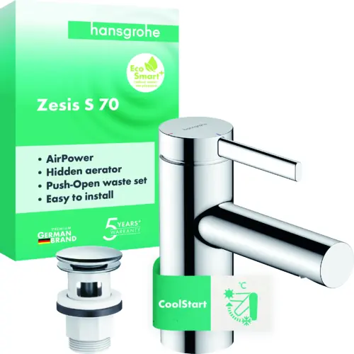 hansgrohe Zesis S Einhebel-Waschtischmischer 70 CoolStart mit Push-Open Ablaufgarnitur, Chrom