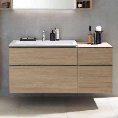 - Für die Installation von Unterschrank und Waschtisch wird ein Geberit Waschbeckenanschluss Raumsparmodell benötigt ( muss separat bestellt werden), passender Artikel 152.091.21.1