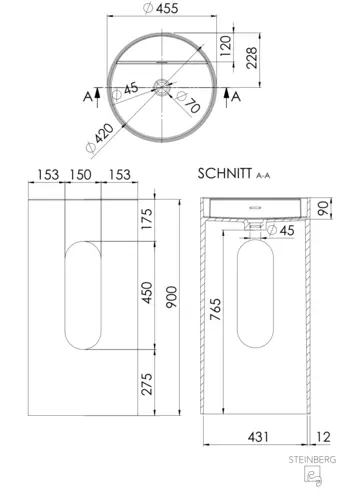 Steinberg Serie 540 Standwaschtisch, bodenstehend, rund, mit Überlauf, 455x455x900mm