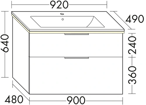 - 1 Schublade oben, 350 mm tief, mit Siphonausschnitt und Inneneinteilung