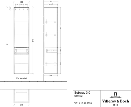 Villeroy & Boch Subway 3.0 Hochschrank, 1 Auszug und 2 Türen Anschlag rechts, 400x1710x362mm
