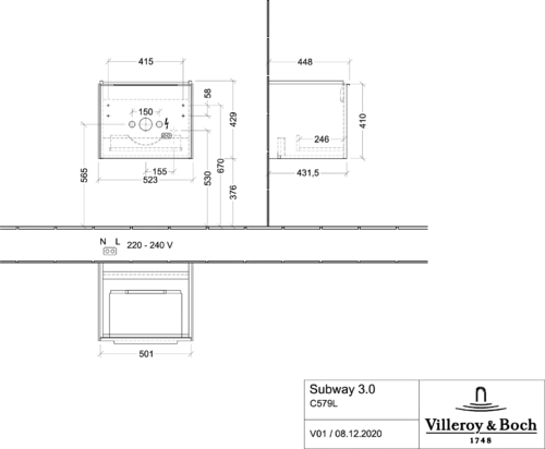 Villeroy & Boch Subway 3.0 Vanity unit, LED lighting, 1 drawer, 523x429x448mm