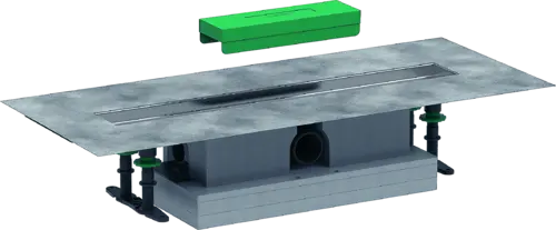 - bestehend aus: Installationsset, Grundkörper, werkseitig vormontiertes Dichtvlies, Siphon, Höhenverstellplatten