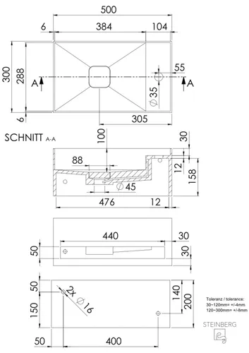 Steinberg Seriess 440 wall-mounted washbasin, with overflow, with tap hole right, 500x300x200mm, SOLIDSurface