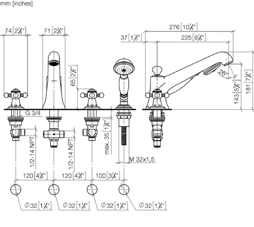 Dornbracht MADISON four-hole bath mixer for bath rim installation, projection 225mm