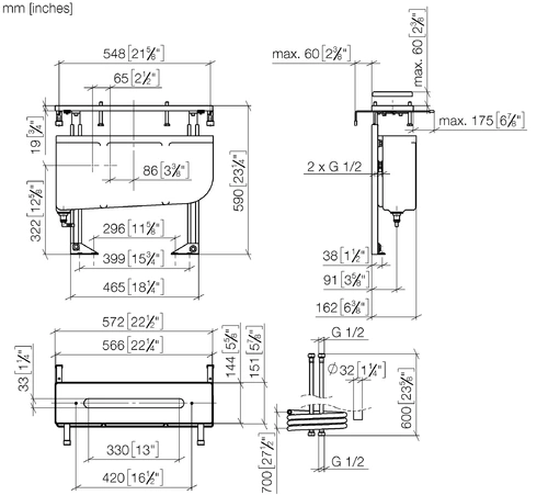 - Mounting plate dimensions 566 x 144 mm