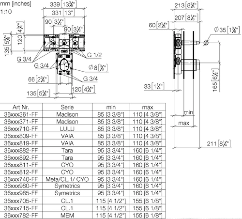 - 2 x connection 3/4" female thread (cold/hot), DN 15