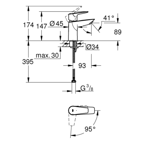 Grohe BauEdge single-lever basin mixer, S-size, 95 mm projection, without drain set, EcoMode, Cradle to Cradle Certified® Gold