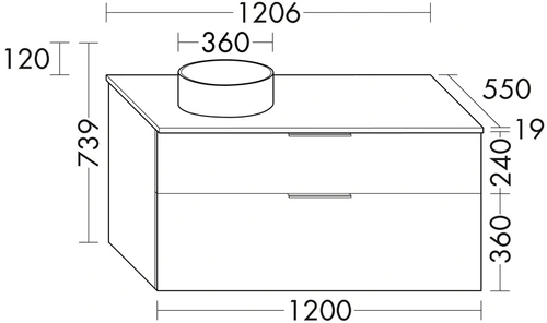 - 1 drawer at the top, 350 mm deep, with siphon cut-out and internal divider