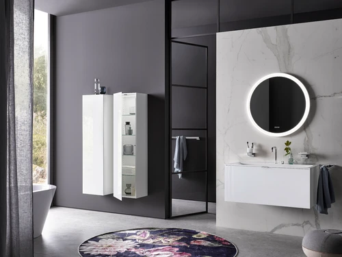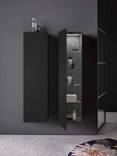 emco evo tall cabinet, 1500mm, glass door, tip-on fitting, 4 glass shelves, LED interior light