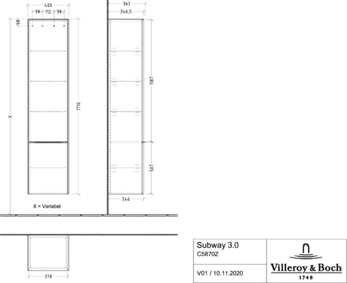 Villeroy & Boch Subway 3.0 tall cabinet, 2 doors stop right, 400x1710x362mm