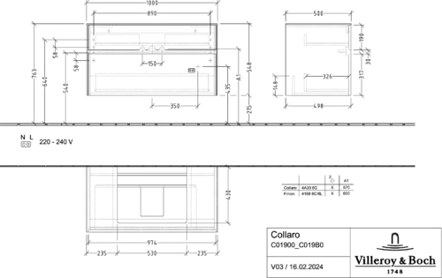 Villeroy & Boch Collaro washbasin vanity unit, 2 pull-outs, washbasin centre, wall-mounted, 1000x548x500mm