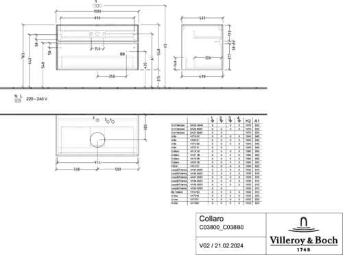 Villeroy & Boch Collaro washbasin vanity unit, wall-hung, 2 pull-outs, washbasin centre, 1000x548x500mm