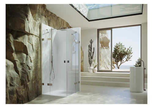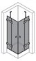 - frameless corner entrance with two glass panels, opening inwards and outwards